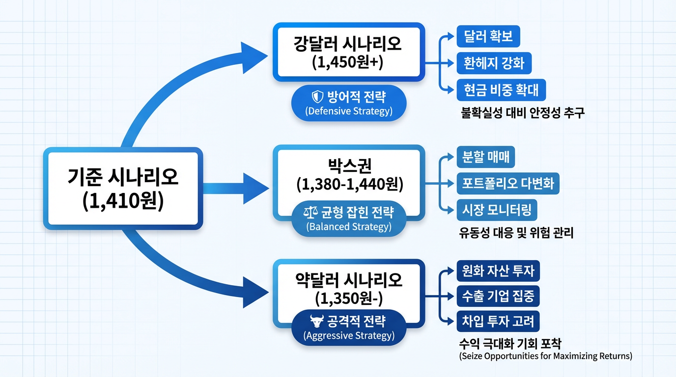 한국무역협회는 "2026년 상반기에도 달러-원 환율은 하단이 비교적 단단하게 지지된 상태에서 1,400원대에서 움직임을 전개하며 상하 변동성 리스크에 노출될 전망"이라고 밝혔습니다. 경제체질 개선 없이는 고환율 뉴노멀이 지속될 것이라는 진단이더라구요. 투자자는 연평균 1,410~1,450원을 기준 시나리오로 삼되, 상하 50원 범위의 변동성에 대비해야 합니다.