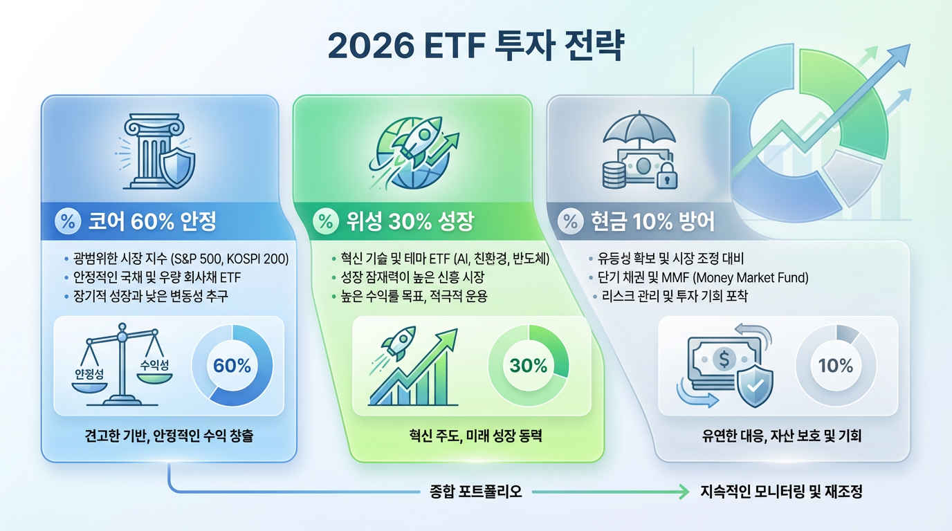 네이버 블로그(mayo51)는 "2026년 ETF 구성은 (1) 코어 지수로 중심 잡고 → (2) AI·반도체 같은 성장 테마를 얹고 → (3) 배당·채권·금으로 방어력을 더하는 방식이 가장 안전하다"고 제시했습니다.
