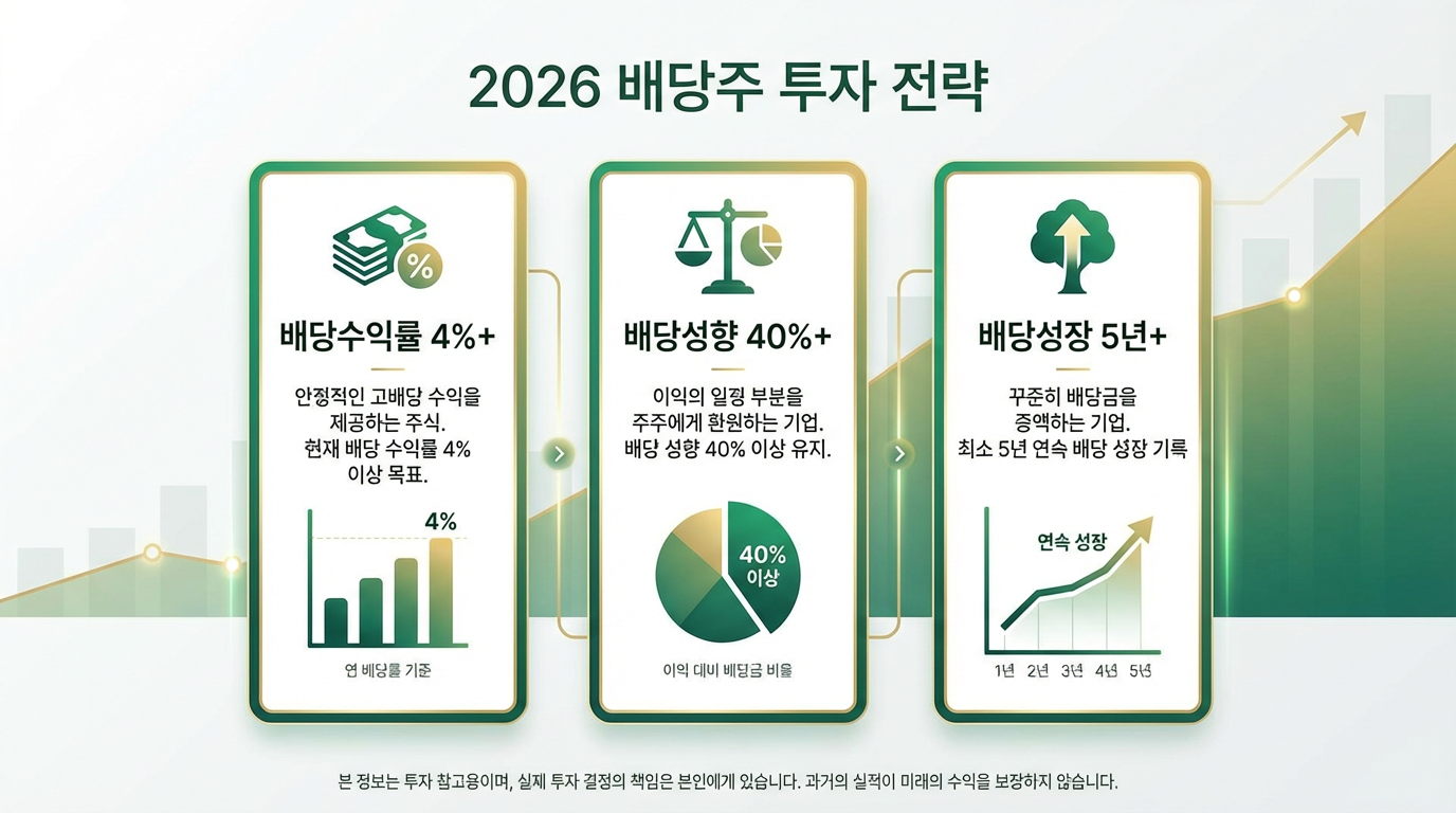 | 배당수익률 | 4% 이상 | 연 배당금 ÷ 현재 주가. 4% 이상이면 고배당주 |